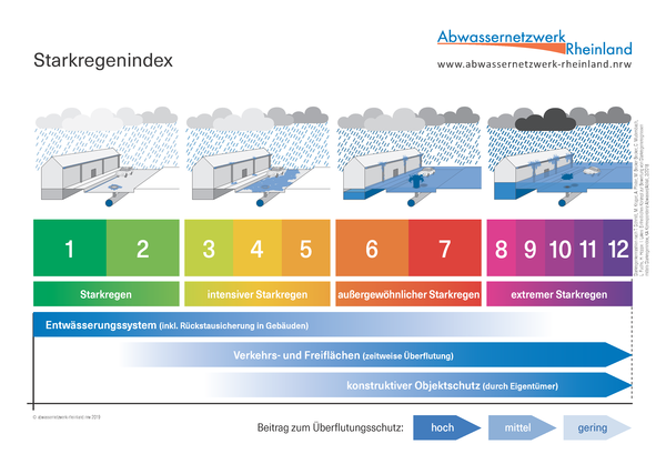 Der Starkregenindex beschreibt die Intensität des Starkregens. Die Gefahren durch Starkregen sind immer von Ort zu Ort unterschiedlich und können nicht verallgemeinert werden. In den Grafiken des Starkregenindex werden somit die oft zu beobachtenden Folgen von Starkregen bildlich dargestellt. Sie reichen von überlasteten bzw. überlaufenden Kanalnetzen bis hin zum vollständigen Überfluten von Oberflächen. Um sich effektiv vor Schäden durch Starkregenereignisse zu schützen, ist immer eine genaue Risikoanalyse durch Experten vor Ort notwendig. Beispielsweise kann die Hanglage einen erheblichen Einfluss auf Gefahrensituationen haben. Für eine Übersicht der Schutzmöglichkeiten finden Sie auf dieser Seite (unter Downloads) ausführliche Informationen als PDF-Dokument zum Nachschlagen. Diese Informationen wurden freundlicherweise vom Netzwerkpartner des Abwassernetzwerkes Rheinland, den Stadtentwässerungsbetrieben Köln (kurz StEB Köln), zur Verfügung gestellt.