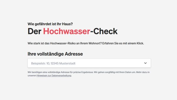 Sie müssen nur Ihre Adresse eingeben – und schon erhalten Sie das Ergebnis bzw. das Hochwasser-Risikofür Ihren Wohnort inklusive Empfehlungen für Mieter und Immobilienbesitzer.
