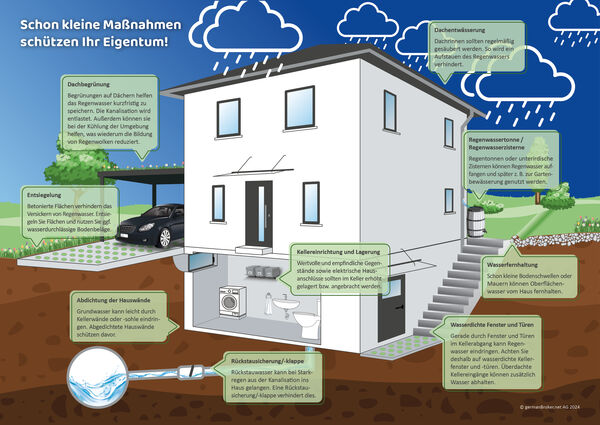 Deutschlandweit sind bislang nur etwa die Hälfte aller Wohngebäude umfassend gegen Naturgefahren versichert. Neben einem Versicherungsschutz sind Prävention und Eigenvorsorge zentrale Bausteine für die Vermeidung von Schäden. Unabhängig vom Versicherungsschutz sollten alle, die ein Haus besitzen oder gerade bauen, den Überschwemmungsschutz mitdenken und notwendige Schutzmaßnahmen einplanen.
