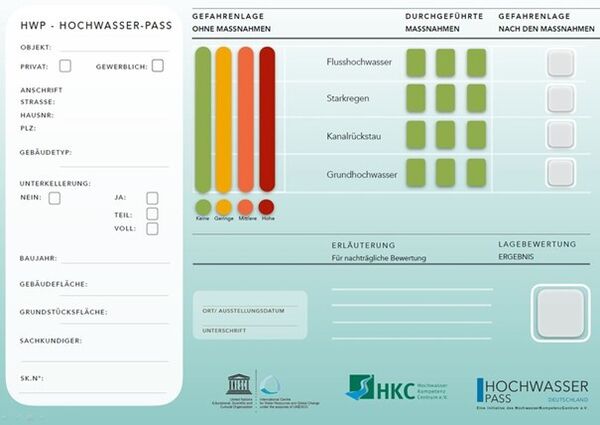Dazu hat das HochwasserKompetenzCentrum (HKC) e.V., gemeinsam mit dem Gesamtverband der Deutschen Versicherungswirtschaft (GDV), den Hochwasserpass erstellt. Dieser ermöglicht eine einfache Ermittlung der individuellen Gefährdung für Hausbesitzer und für Versicherer liefert er die Grundlage für passgenaue Elementarschadenpolicen.